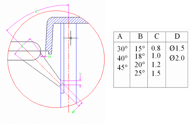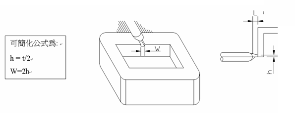 適用於大部(bù)塑料、各種側邊允許澆口(kǒu)痕跡的製品,開在製品的邊緣或邊緣頂麵,又分標準入水、搭接(jiē)入水和扇形入水,下圖中t為產品壁厚,L一般為(0.8—1mm)